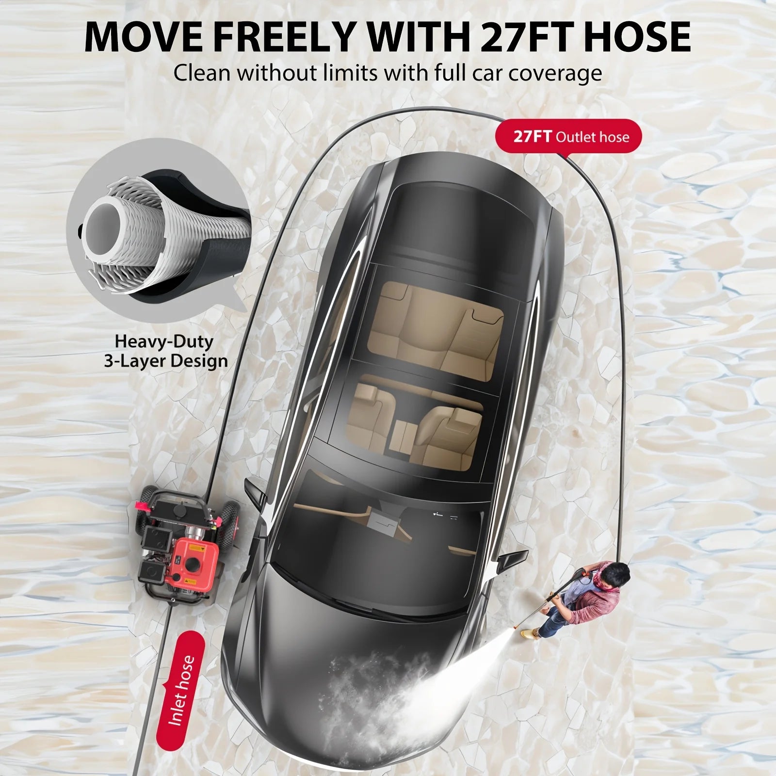 - 27 ft hose offers extended reach to cover large areas and hard-to-reach spots.