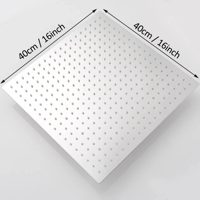 Built from solid stainless steel with a mirror-like chrome finish, it offers durability, corrosion resistance, and easy wipe-clean maintenance. The 16-inch square head projects a broad rainfall pattern, enveloping your body with soothing streams for a true luxury shower.